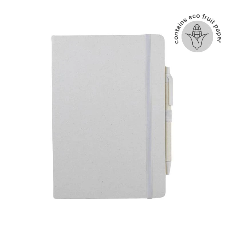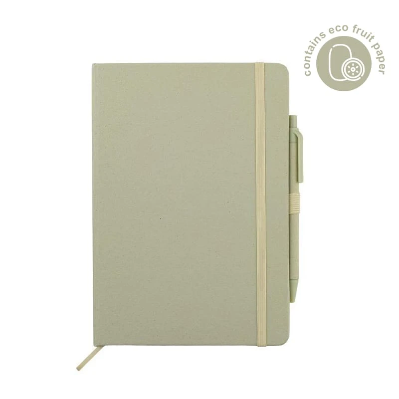 Set of A5 Fruit Paper Hardcover Notepad and Pen in Gift Box. Both notepad cover and pen barrel contains sustainable fruit papers that are created from the residues of agri-food industry (such as cherry orchards). Notepad includes 160 pages of 70g ruled pages. Pen is a ball pen with matching fruit paper barrel. Presented in a sliding gift box.